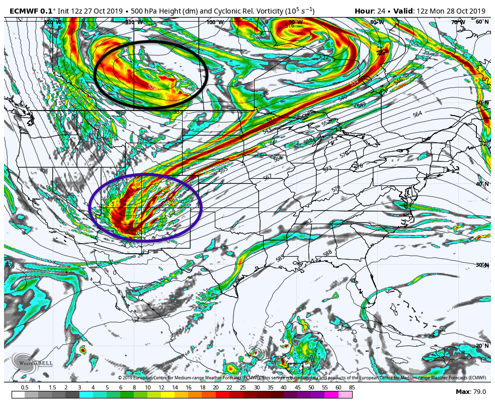 500mb Vorticity (energy) on Monday, October 28th. The blue circle is the first piece of energy. The black circle is the second.