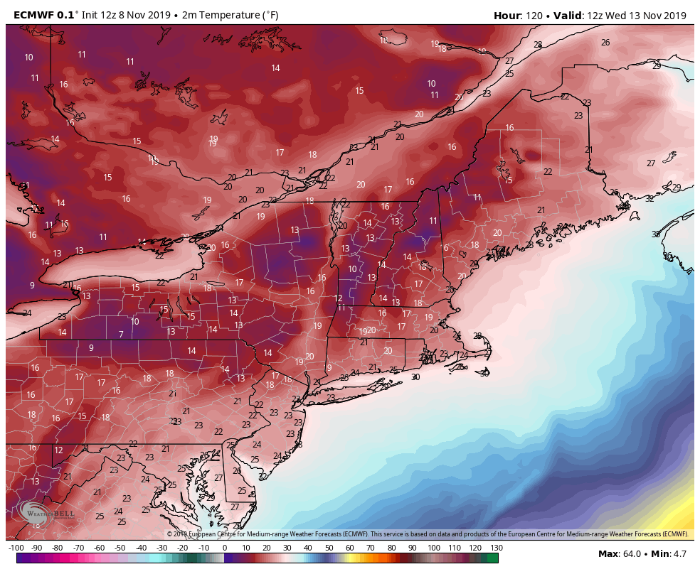 This cold blast holds through Friday morning (11/15), ahead of another system heading up the eastern seaboard. Temperatures briefly warm as we head into the following weekend (11/16-11/17) but there are diverging signs of whether the incoming system will be more rain or mixed. It does not look like substantial cold air will be in place for it, but may return behind it briefly into the week of 11/18.