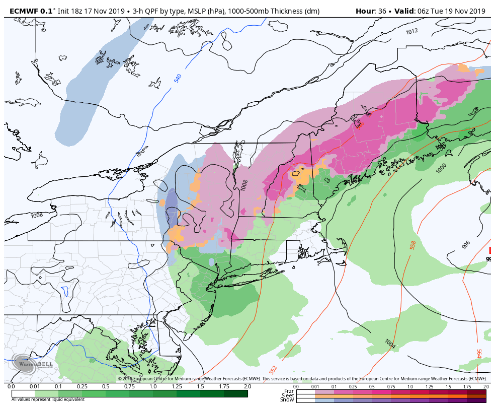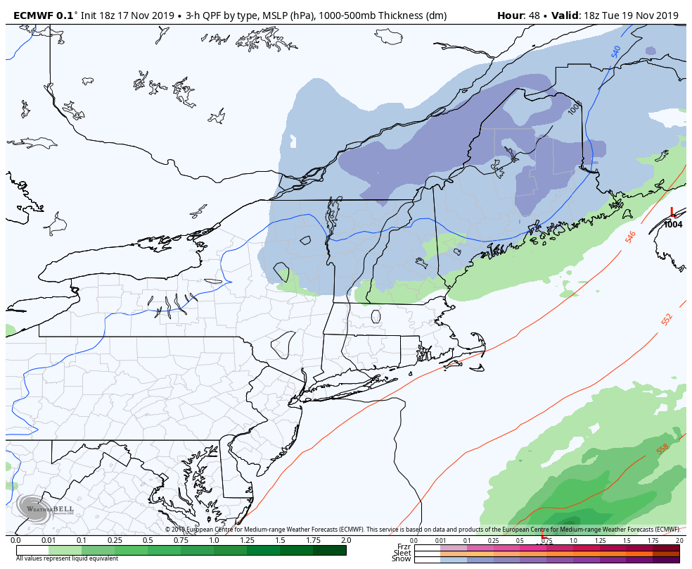 Overall, this storm is a mess. But it’s the first decent low pressure system to come in since many resorts have opened, and it’s the first of several. Let’s take a look at the succession of the storm from Monday night through Tuesday afternoon. We’re talking ice accretion up to .20″, mixing with sleet, eventually changing over to snow (1-3″ possible for MS, WC & Hunter) before hightailing it out of New England. Should be an interesting cross-section of the snow when all is said and done. The reason for this “mess” is cold air damming (CAD). It’s not the most classic case given the two shots of precipitation, but when we start seeing a relatively light northeast wind at the surface, and some southerly component in the higher elevations, the warmer air invades the mid-layers but cold is trapped in the low levels. Cold air is heavier and more dense than warmer air, so the warm air just glides right over the stubborn low-level cold. Therefore the snowflakes melt in the warm layers, and we’re left with only three options – rain, sleet, or freezing rain. Perhaps we’ll do a deeper dive into CAD at another point. But it is the culprit for bringing mixed precipitation and ice events to the Northeast.