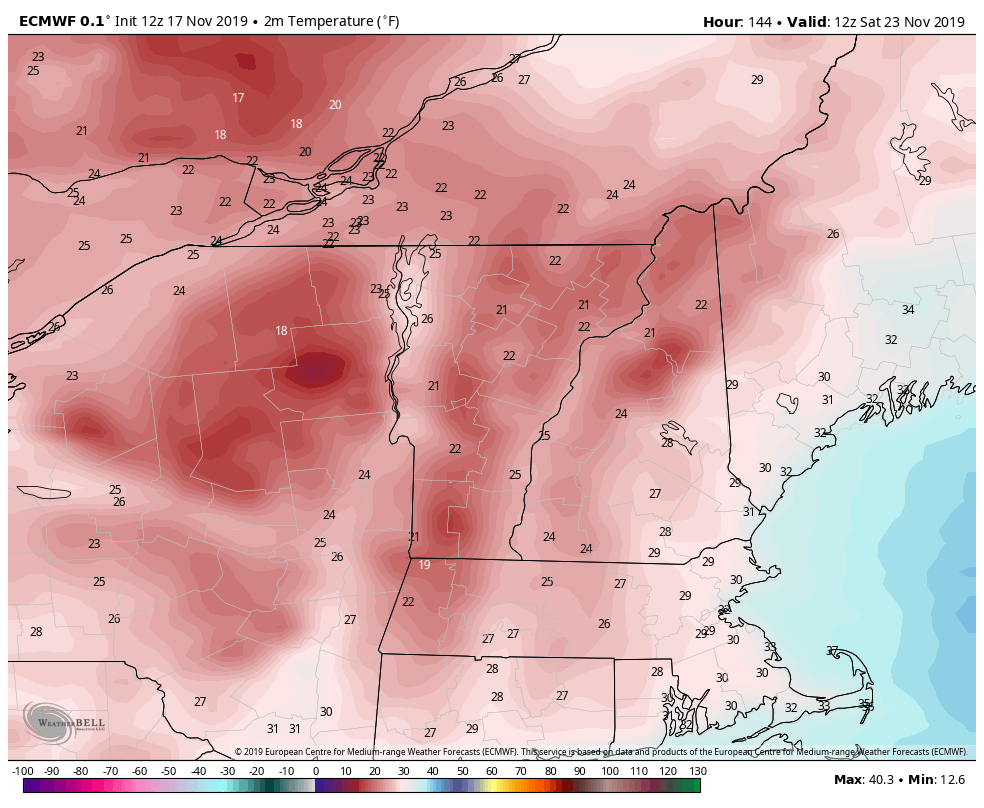Thursday is even a touch cooler before the next system pushes into the region Thursday night. Another mixed precipitation system – but stronger – will bring in much colder air behind it for the Friday night to Saturday afternoon time period. Wind will pick up behind this system, Friday evening into Saturday. Again, cold is short-lived, before another system comes up the coast on Monday, which again, may be mixed. Looking at potentially a fourth system arrives in time for Thanksgiving dinner.