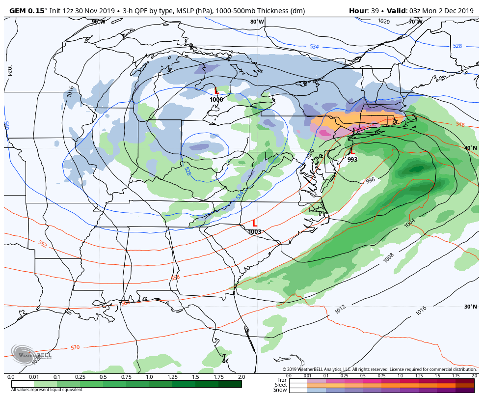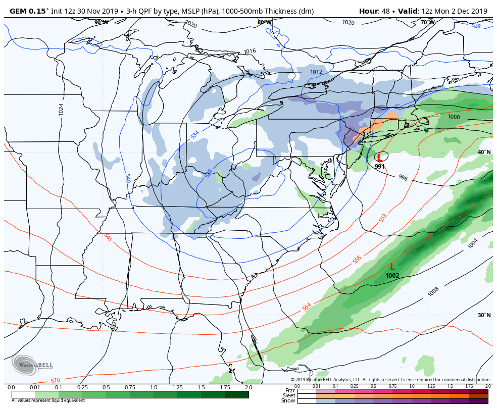 Because of the delay in the our lows becoming vertically stacked, we have this “lull” during the energy transfer, creating an axis of snow that sits over central NY and southern VT/NH. This creates a continuous light to moderate snowfall during the day Monday, when most areas aren’t seeing accumulating snow. When the precipitation is fairly light, we may see some sleet or freezing rain mix in before the intensity picks up again.