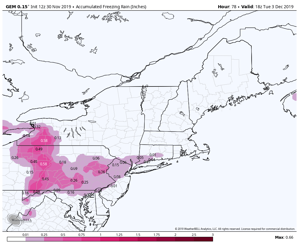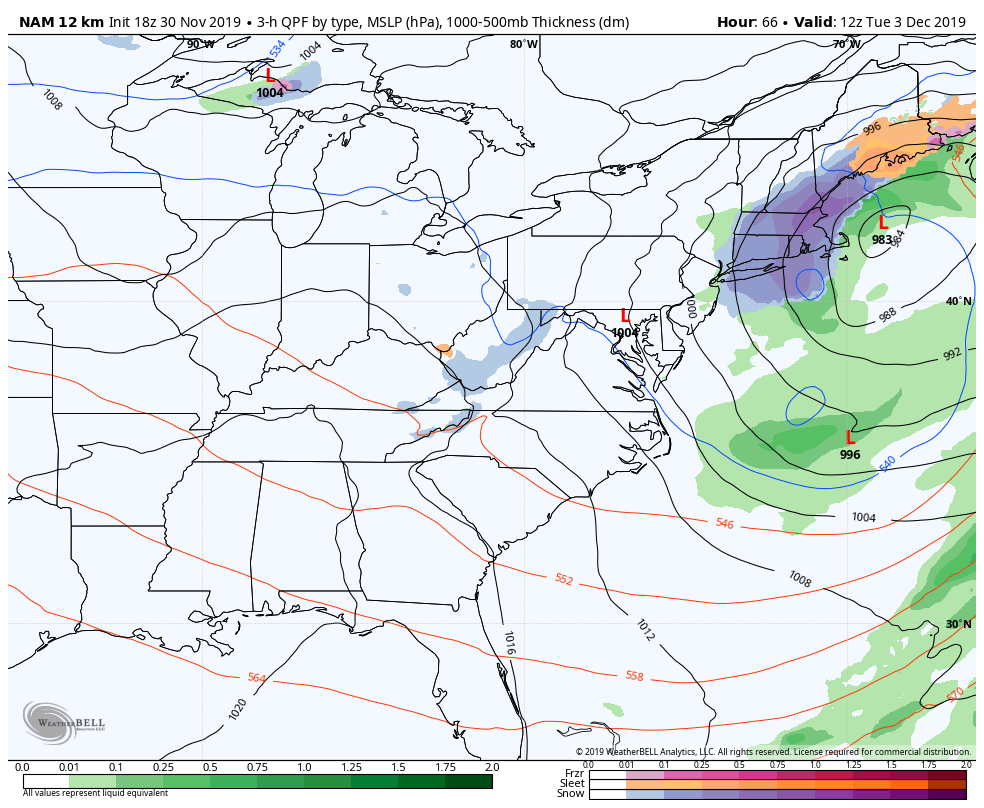 Notice the bulls-eyes in the those areas. This model, the NAM, typically enhances the snowfall amounts a bit much. While I think these totals are too high, the jackpot areas are in the correct spots. I anticipate 12-16″ at Mount Snow, and 14-18″ at Hunter. Wildcat & Attitash can expect 3-6″ and our Pennsylvania resorts will be more prone to a larger freezing rain event compared to snow. Total snow will likely stay under 1″ in the those areas.