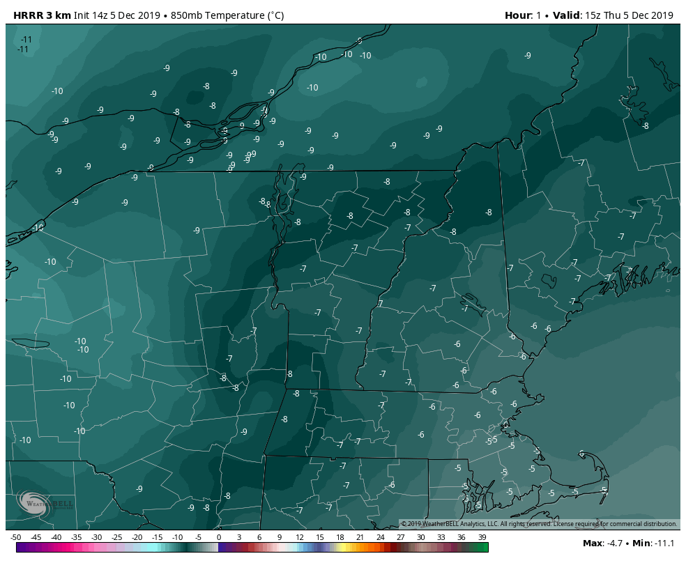 These are 850mb temperatures (~4,500 feet) valid at 10am on Thursday. You can see the hang up of the cold air in the Adirondacks (thanks Whiteface!), and instead of moving through Vermont, it’s streaming in north of Mount Mansfield, through northern New Hampshire (Wildcat summit 21° at 12pm) and Maine (Sugarloaf summit was also 21° at 12pm). But on the southern end, it circles up underneath the Adirondacks, and impacts Hunter, Stratton and Mount Snow, before impacting Killington, Sugarbush or Stowe. In the topographical map, it’s easy to see why it would take that path.