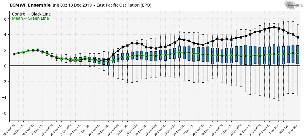 So what are we looking for the holiday week? Through Christmas itself, we actually have fairly decent agreement on a quiet but cool pattern. After the snow showers/squalls associated with the arctic front, there’s not much more to our precipitation outlook. The AO/NAO looks to stay negative through 12/26. We’ll have some moderation into 12/22-23 with base temps in the 30’s but no real warmth. It’s at the post-Christmas point that there’s major divergence in the teleconnections on settling back into the winter pattern, or hanging out in this moderation. The next significant system arrives around 12/29, but it is too early to tell which way it’s going to pull. Typically you need you get through a major pattern change (arctic front) before you can clearly see the next one. Shown below is the EPO (Eastern Pacific Oscillation), which gives us an idea where the troughs/ridges are setting up. Most positive EPO patterns usually are not good for Northeast snow.