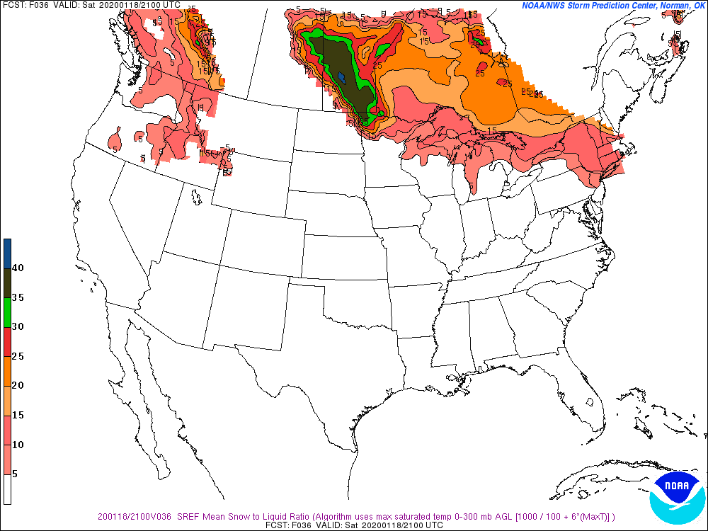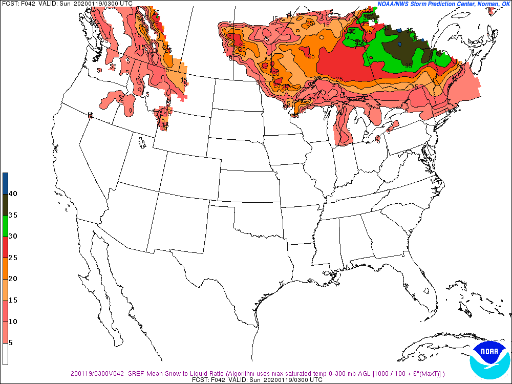 I’m expecting 3-4 more inches at Wildcat/Attitash than Mount Snow and especially Hunter – this is because of the snow to liquid ratio (or equivalent). The snow ratio is how much volume of snow you get for a given volume of water. A typical ratio is 10:1 – meaning for one inch of liquid, you receive 10″ of snow (makes some cold rain storms even more annoying now, huh?). That’s an average ratio, but it doesn’t always work.