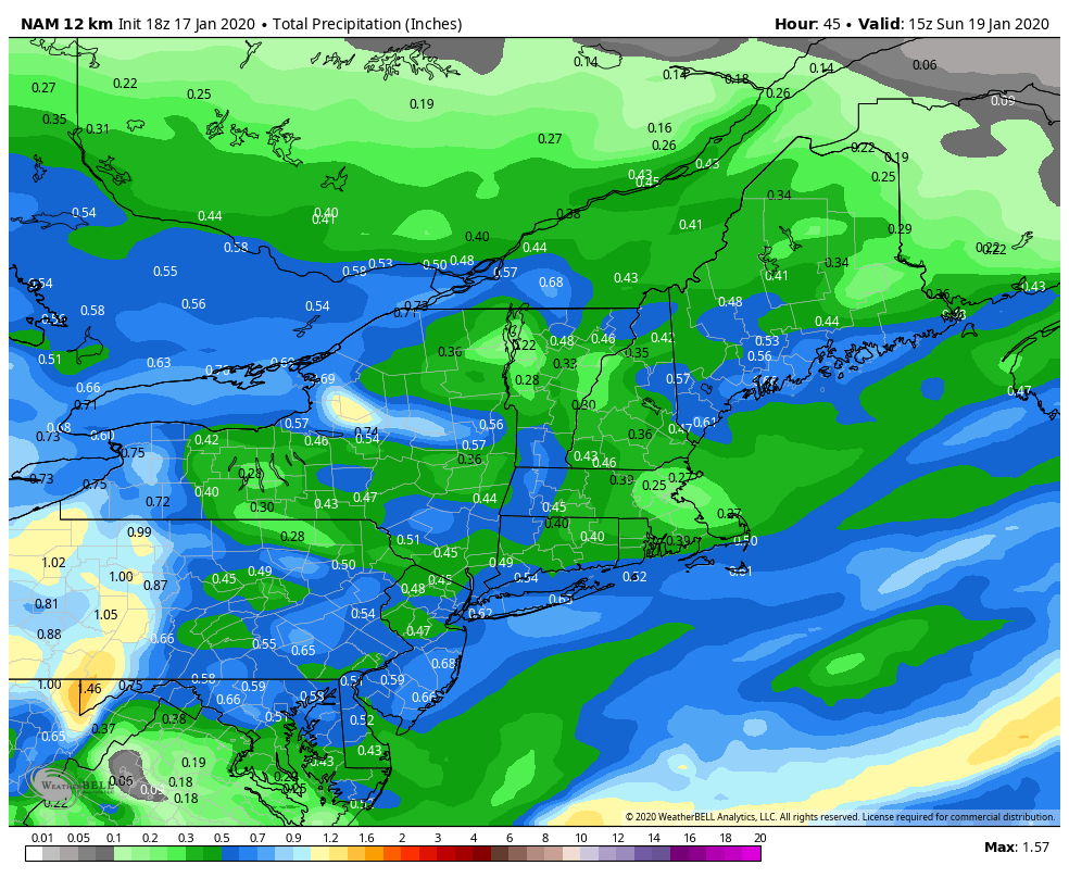 The first image is the total precipitation projected for the storm. This is considered “liquid” – so we’re taking precipitation type out of it, but if you melted everything and it was all water, this is what would fall. Notice that Mount Snow actually should have more liquid falling than Wildcat/Attitash. Hunter is about the same for liquid, so you might think that the snowfall amounts would be within an inch of each other.