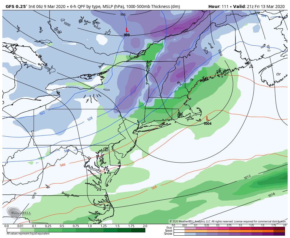 Our PA Resorts are winding things down this week as temperatures boost to near 70 degrees on the the hill. Farther north, it’s not exactly chilly and we’re tapping into some spring fever. Unfortunately the dreaded ‘R’ word is in the forecast quite a bit this week – first into Tuesday (mostly late afternoon and evening), and again possibly Friday (we saw the 3/12 event last week in the blog) – though we could pull snow for summits, maybe mid-mountain if we can just hold a little bit more chill to the air. The GFS (American model) has been developing a coastal low with this system, which is an outlier of the models but not completely bogus – and if that coastal low does form, the colder air should wrap back in quickly and we should see a better-looking event. The difference maker looks to be the speed of the shortwave – the GFS is slightly slower which is allowing this secondary low to form, while the Euro is faster and doesn’t give it the opportunity. This piece of energy comes onshore tomorrow morning so we should have a better look at it by Tuesday evening. Here’s a look at Euro w/o the coastal low, and GFS with the coastal low. It makes a big difference!