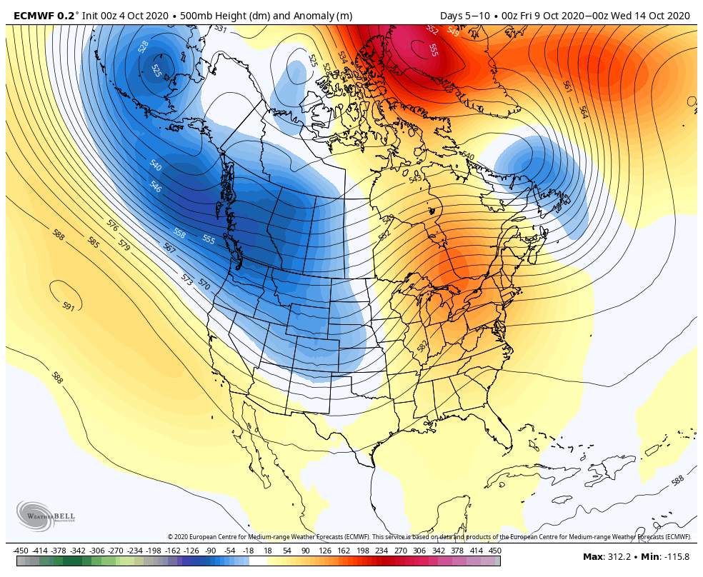 The other piece to this puzzle is the warmth that comes in fairly swift behind the cool down. By Saturday we’ll be back into the low to mid 40’s at the summit, and potentially closing in on 50 degrees Saturday evening ahead of another cold front that sweeps in. That again will drop temperatures back down through the day Sunday, and we could reemerge into snowmaking levels Sunday night into Monday (10/12). There are some inconsistencies in the pattern following the cool down on Monday; we certainly warm up again for a couple days (as seen in the 10/9-10/14 image), however the depth of that warmup and how quickly the next cool down arrives is still quite a bit uncertain.