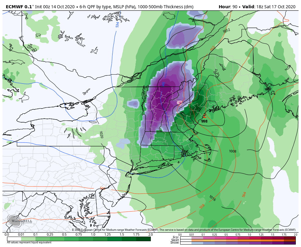 While the feedback from the model shows fairly widespread snow, most of this will occur at mid to summit levels. That’s not to say that in some intense bands we couldn’t see some snow reach the base, but it would likely melt on contact, or melt as soon as the intensity lets up. Base temperatures should stay 33-35 degrees, whereas mid levels hover around 31-33 degrees, and summits get down to 28 degrees. How quickly this occurs depends on how quick and deep the low strengthens. Nonetheless, this heavy, wet snow may bring down any weak branches/trees, and potentially lead to power problems.