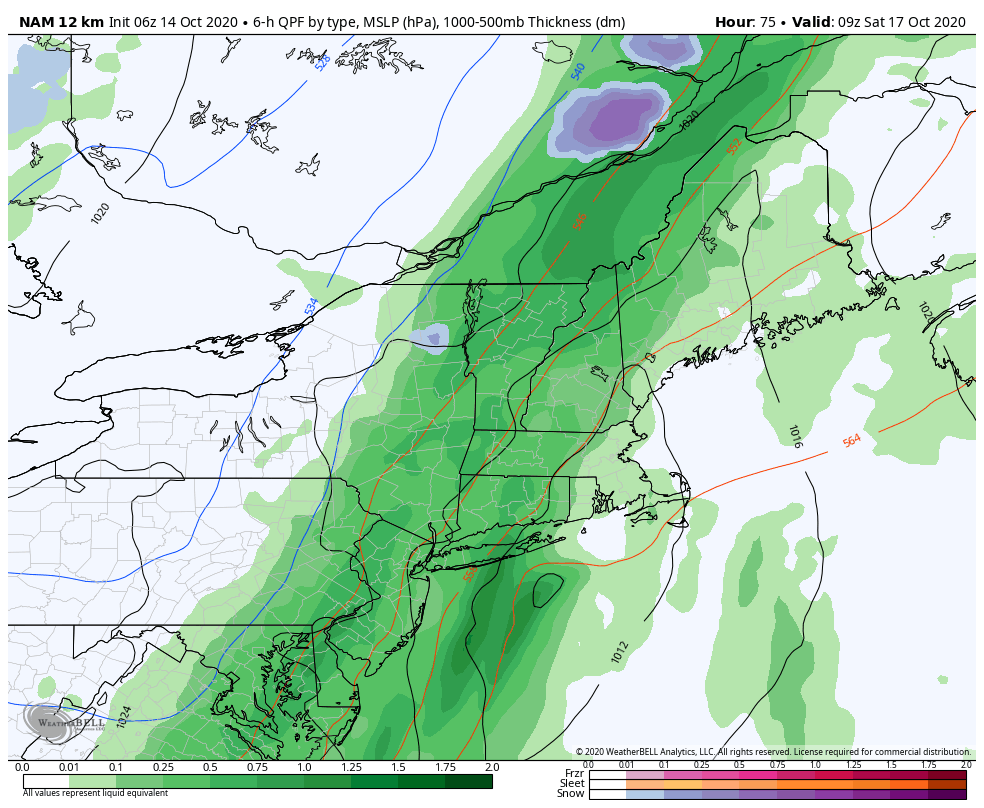 NAM 8am Saturday – Notice the low beginning to form south of Long Island, NY. Some precipitation beginning to change over near Whiteface.