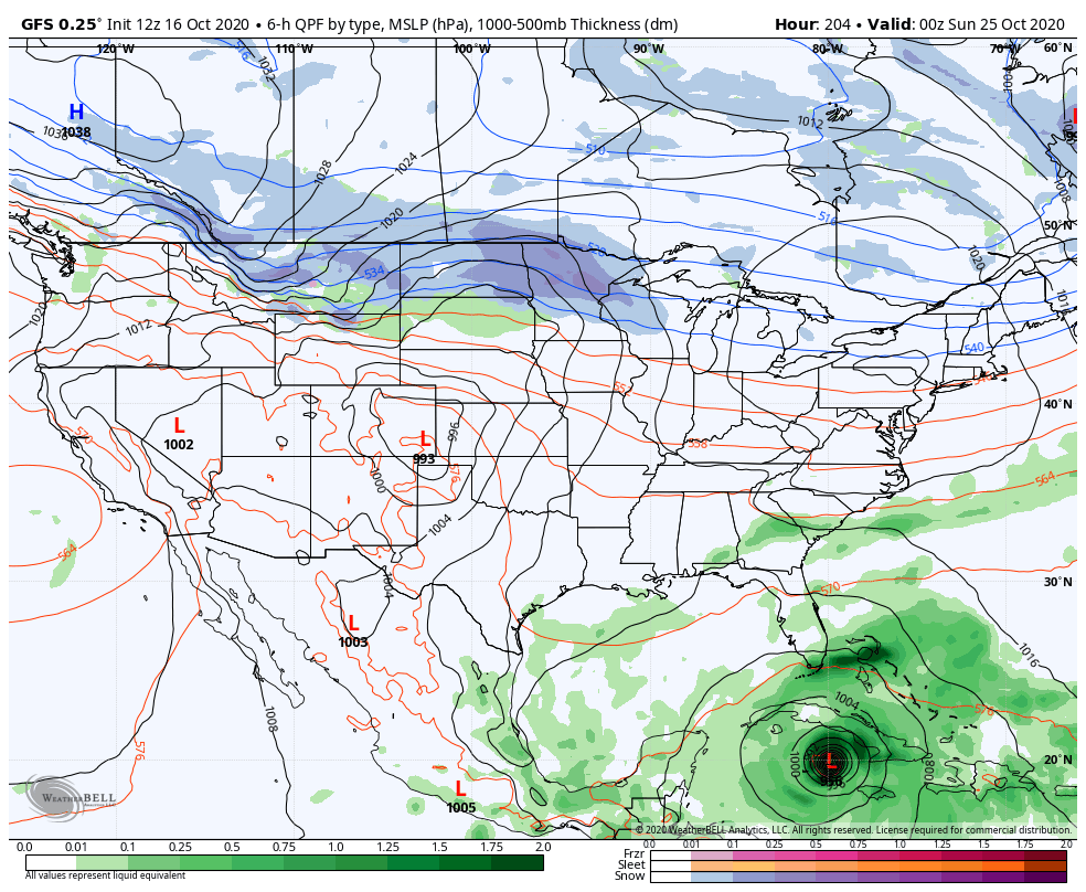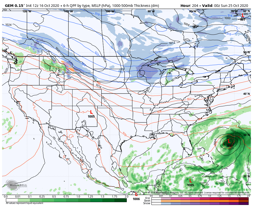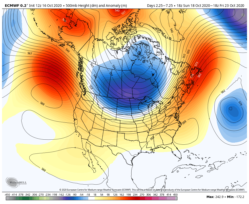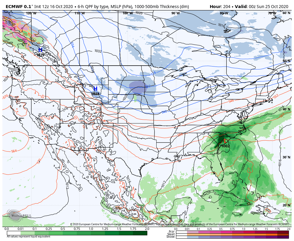 We’re 10 days away from this, so plenty of time to change exact locations and features. But the take-home message is that we’re going to be on a wild ride toward the end of the month. Until we get that bulldozing low pressure and polar air mass to stake its claim into northern U.S., snowmaking opportunities look minimal at best. This system doesn’t necessarily have to knock out power, uproot trees and pummel us, it just has to be strong enough to allow space for the cold air to come in. It could go entirely offshore. However, there is consensus that we should be seeing a strong system, whether it hits us head on or not, to change the pattern in the last week of the month. This, of course, is contingent on the tropics shutting down as well. As long as the tropics remain active, cold air will struggle to move south, and stay south, for any prolonged period of time.