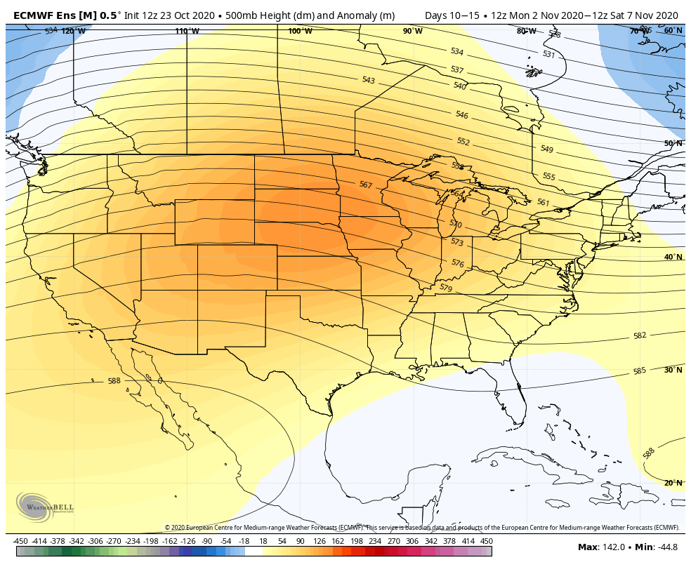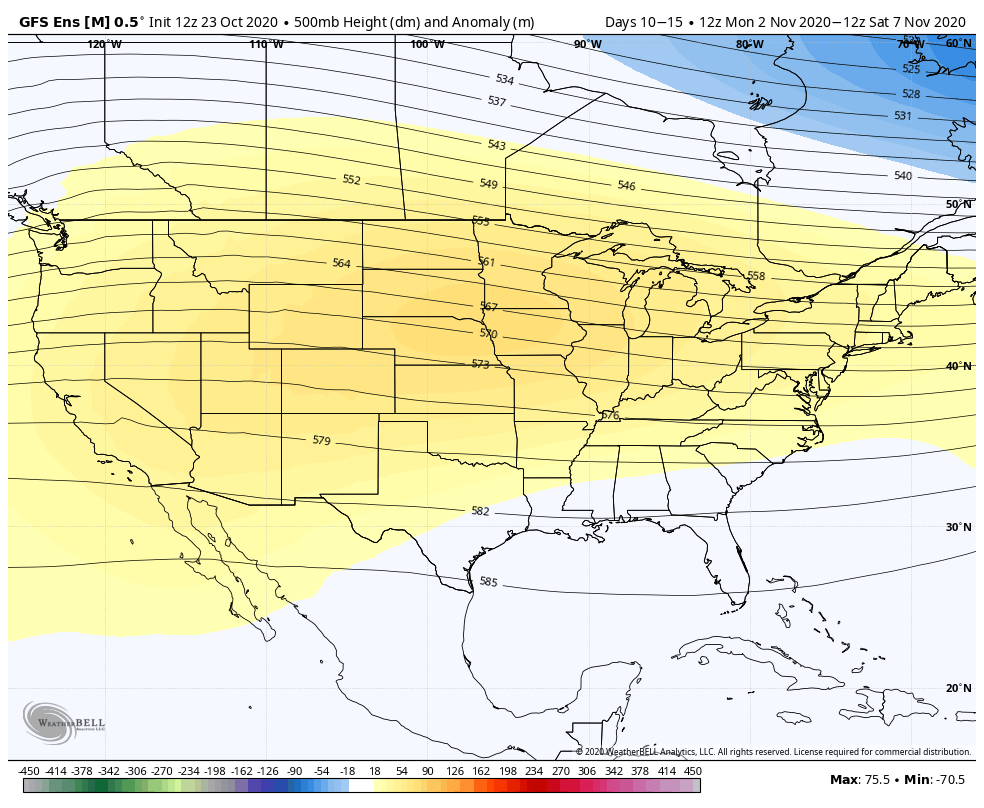 Looking beyond next weekend, it does not look favorable at this point. Of course we’re talking fairly far out, but the first half of November is looking relatively warm with a large ridge draped over the lower 48. This keeps all the cold bottled up north.
