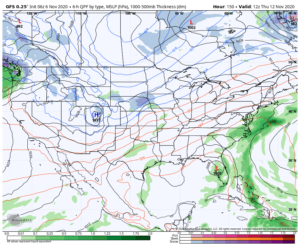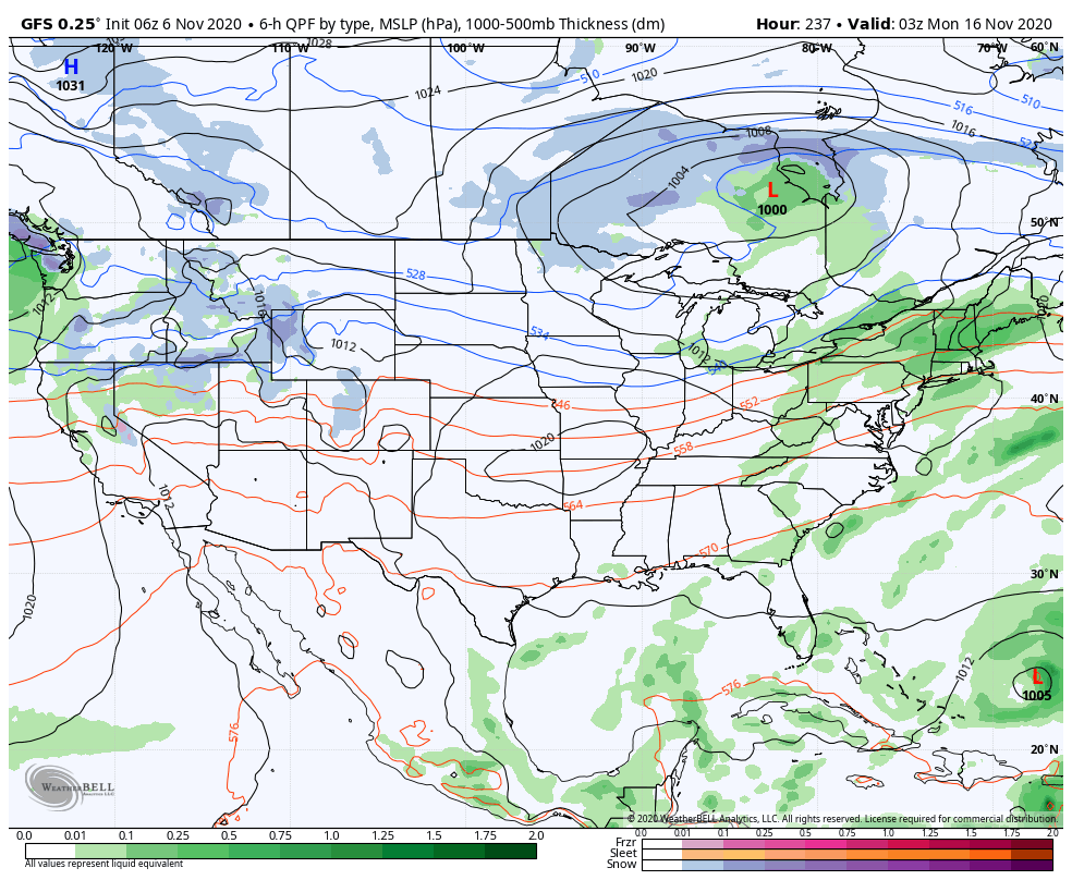 After a brief landfall or near miss to the Florida Keys this weekend, Eta will then hang out in the eastern Gulf for a few days, before getting picked up by the second piece of energy that ejects from out west at some point toward the end of next week. The first piece of energy comes through around 11/11, bringing mostly rain and only a small drop in temperatures for the east. Our system with the energy from Eta pushes through toward the end of the week, which drops temperatures again, but still remaining seasonable/seasonably warm. Once that pushes offshore over next weekend, we stop the battle with the tropics, and the trough out west can finally begin to spread east. Around the end of next weekend into the beginning of the following week (11/15-11/18), it looks as though we’ll finally have the opportunity for cold shots. They look to be inconsistent at first, but eventually settle in a bit deeper each time.