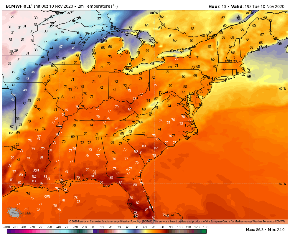 The warmth continues today as the front slowly makes its way through Minnesota, Iowa & Wisconsin this afternoon. During the overnight, the front will cross through Michigan. By Wednesday, we notice that the front is becoming more elongated E/W instead of the NE/SW orientation it has in the 11/10 image. Therefore, it will take a bit longer for temperatures to come down through the night Wednesday and into Thursday as the front slowly sags southward. That cool down isn’t one that will make waves for us, but rather the secondary front that comes through later Friday.