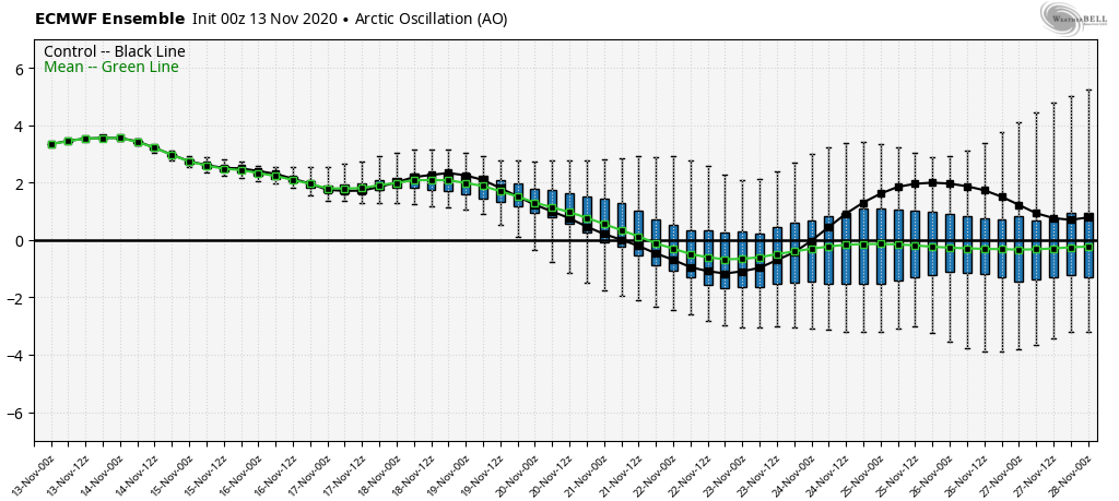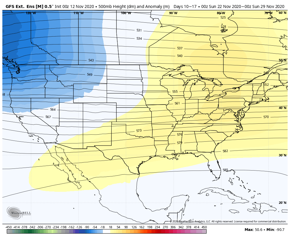 A low pressure system moving along this trough is going to be the deciding factor as to how much of this cold stays into Friday, and potentially gives us a light snow event, or if we warm up slightly, and end up with some rain. There has been some consensus on the former, and with another system quickly on its heels. Teleconnections show this as well, with a trough around 11/22-11/23.