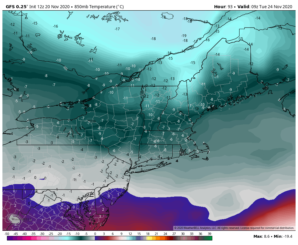 Moving through Sunday, we’ll see a bit of cold air damming develop, which holds in some of the cold air as the incoming system arrives. The damming will slowly erode as we move into Monday morning, but there’s still the chance of some wet snow before sunrise on Monday. Rainfall is likely to be around .50″ with this system moving through. It will exit the area Monday afternoon and temperatures begin to crash shortly thereafter. Again, this will not be a very deep batch of cold air. The bulk of the coldest air stays into central & southern VT/NH & ME, though the overall cold air mass extends down to the Mid-Atlantic.