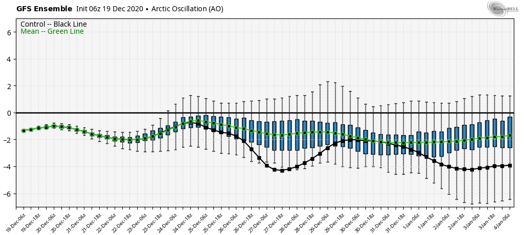 Behind this system, a cold pattern prevails through the rest of the vacation time period. Notice the GFS Arctic Oscillation has very few positive ensemble members. Therefore we’ll at least have opportunities to get the snow guns on after a potential rain event.