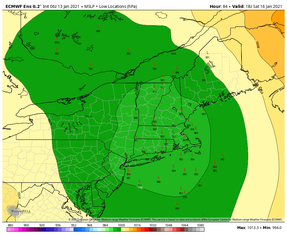 The ensemble low positions are fairly congregated closer to the Euro deterministic run that we see, which is favorable for more snow than rain for New England.
