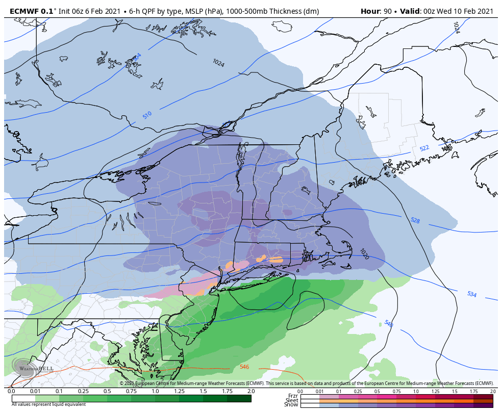 The energy train continues into Tuesday. Once again the models aren’t terribly excited about phasing this energy either, but the low center is closer to the coast. The energy associated with this system comes onshore later tonight, early tomorrow. In this current series of storms, models have been struggling with the strength of these energy centers and their interaction with other energies. Therefore once we can get some upper air data, we’ll have a better idea on how Tuesday plays out. On the current track would allow for some light to moderate snowfall to overspread New England, and it’s possible that the Mid-Atlantic holds onto some cold too – hopefully eliminating any mix potential.
