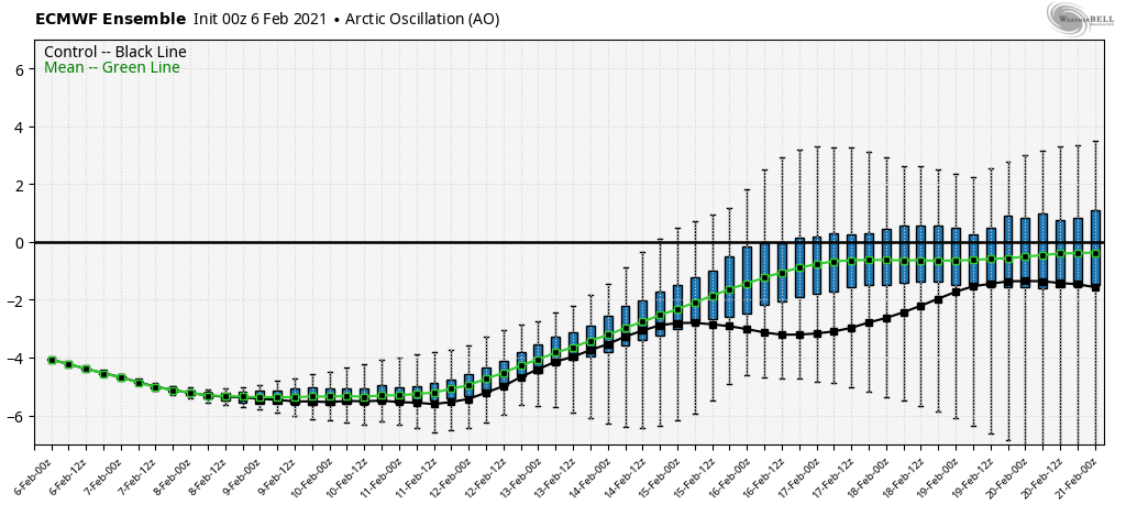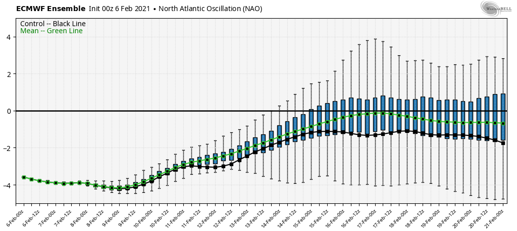 The NAO, which is strongly negative now and partially a reason for the lackluster performance of the snow tomorrow, is starting its ascent toward neutral beginning early this week. Weakening the negative NAO should allow for some more storms to be impactful to the Northeast, which models have already picked up on. Therefore this precipitation pattern will likely continue into the end of the month. However, on top of this, the AO begins to turn course as well and move toward neutral. This is the more troublesome part as we may lose the cold dome that we’ve been able to hold on to for weeks now. The “happy place” would be finding a weak-moderate negative in both of these teleconnections to allow for storms to form and move up the east coast, while at the same time we hold the cold.