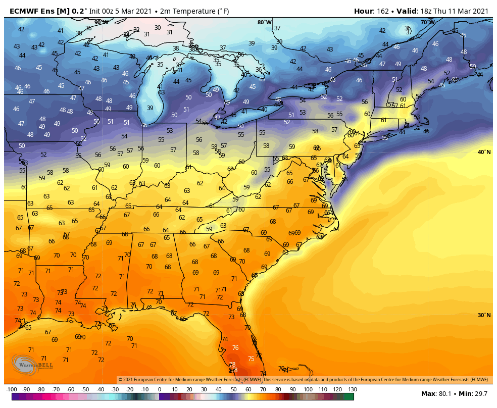 The Euro ensemble, which loves to show an eastern ridge once you get into week 2-3, is pinpointing a fairly amplified eastern trough heading into the week of March 15.