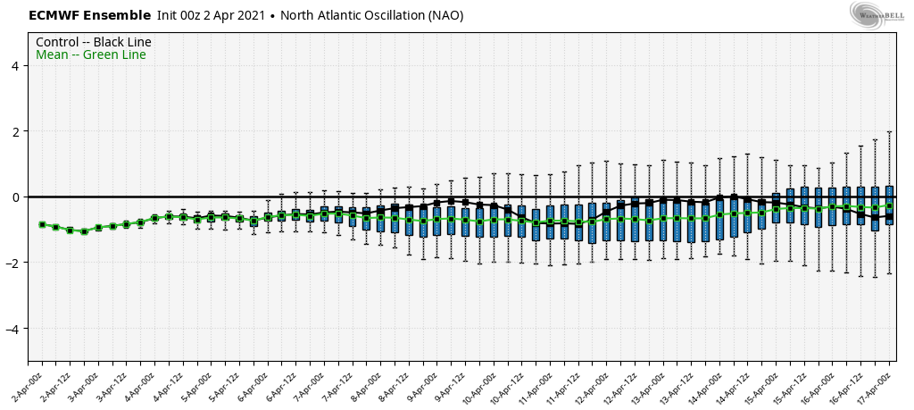 Usually when looking out in time, there are some wild swings because of the different ensemble members. However, this is abnormally quiet-looking, especially in a time when we can still see a bit of volatility for seasonal transition. The PNA turns positive around 4/13, which may start to amplify the pattern more, but we’re not seeing much feedback here in the AO/NAO through 4/15. What looks to be developing is an Omega block. An omega block gets its name because it looks like the greek letter Omega – a trough on the west coast, ridge in the central US, and a trough on the east coast. These are notorious in the spring for very cloudy, dreary weather patterns that prevent the sun from shining for days in the Northeast, and depending on orientation & depth, can affect the Mid-Atlantic, Great Lakes and Ohio Valley too. The lack of flow aloft can also “trap” weak low pressure systems, or upper level lows, leading to continued cloudiness and unsettled weather. Both models have signs of this heading into the mid-month. It was at mid-month I anticipated a turn toward more “transitioning to spring” conditions, however blocking is always something that can disrupt long-term anticipated trends. Omega blocks tend to favor back-door cold fronts and retrograding low pressure systems in the east because the atmospheric flow is “blocked” from the west.