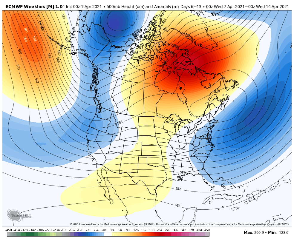 Our first retrograding system arrives Monday-Tuesday next week and sticks around through Thursday. Light snow/snow can be expected in this time period, favoring ME/NH a bit more than southern New England and the Mid-Atlantic. The Euro is hinting at a second one possible next weekend, around 4/12, which is around when the PNA should be picking up and getting the pattern out of this block/traffic jam. However, both models do keep a slight trough in the east through the second half of the month too – which means we may not be seeing a true spring transition until later on in April.
