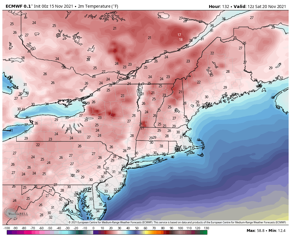 The cold entrenches itself pretty good by Saturday morning in the Northeast. Take a look at surface (2 meter temperatures) for 7am 11/20. Sunday we’ll see some moderation, but that all depends on a low pressure system that’s dancing around the east by early next week. It is too soon to see details in it, however the holiday week looks active. Based on ensembles, there are three low pressure systems to impact the Great Lakes/Northeast from Monday to Sunday of the Thanksgiving week. We’re certainly making up for the very quiet, temperate, and enjoyable weather we saw for the majority of fall thus far.