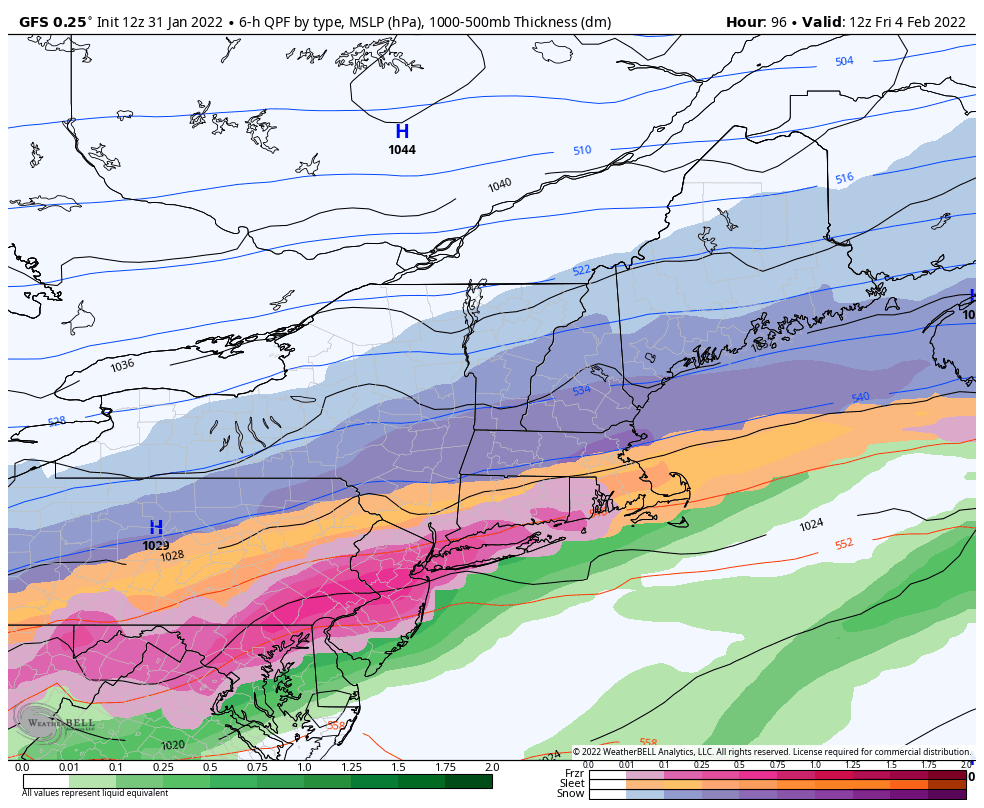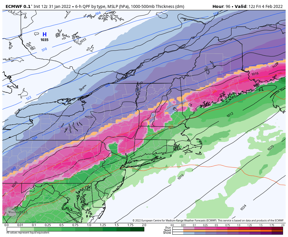 The GFS is the farthest south with the boundary – that provides almost all snow in New England, upstate NY and northern PA – and mixed precipitation into PA, NJ, Hudson Valley, and even south into the MD/WV panhandles and northern Shenandoah Valley. I don’t think it’ll be that cut and dry. This favors the high being stronger and having more “push” on the storm.