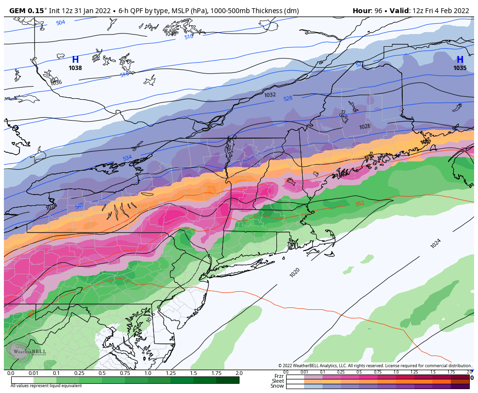 The Canadian is far more bullish on the sleet & freezing rain, which means it sees the cold air at the surface and low levels, but doesn’t believe it will come in the mid and upper levels very quickly – a very slow and methodical transition on a line from Erie, PA – Syracuse, NY – Rutland, VT – Plymouth, NH – Fryeburg, ME. This favors the front moving slower than the low is moving (longer for cold air to move through).
