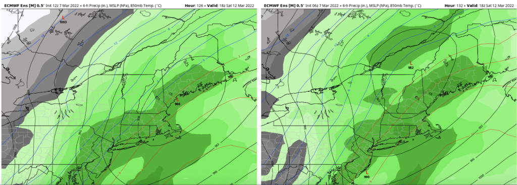 Before the models were really picking up on the aforementioned system, the weekend system looked much warmer. Now we’re starting to see a colder solution. However, we’re not out of the woods in northern New England – it’s a colder solution mostly for VT/NY and some of MA/NH. The GFS had a colder solution up until yesterday, then it went warm – but the ensembles stayed relatively cool. The Euro had a warm solution for days on end, and then turned colder today, as did the ensembles. A huge shift actually. The Canadian was the coldest, but that’s no surprise. However, the Euro and Canadian ensembles now look pretty similar. Below is a look at the Euro ensembles at 12z and 6z.