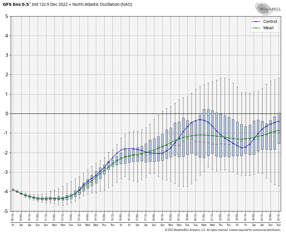Though the blocking from our negative NAO may hold this system down, the clear trend from the image above shows it weakening into Christmas week. This should bode well for systems to be able to come through the Northeast (not shunted south) and keep enough cold for frozen precipitation.