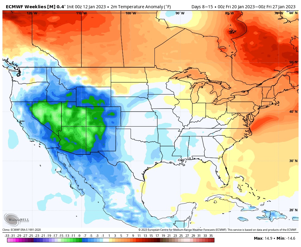 The good news is that from last week’s blog to this week’s, the surface temperature anomaly for 1/20-1/27 has come down a couple of degrees in the east. We are seeing the influence of cold gradually spreading from west to east, and this will all be part of an overall pattern change.