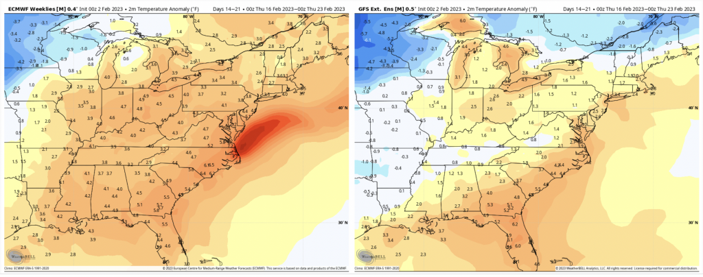 The Euro is a little warmer than the GFS projection, and also is slower to see the warmth retreat. However, the GFS better matched overall temperature patterns in the last 2 weeks, and therefore I’m going to hedge slightly toward that outcome.