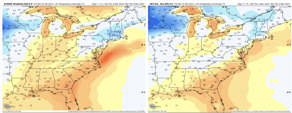 Notice the GFS is a little more on the fence with any anomaly, more middle of the road. This is the SE ridge dying out, with some warmth being pushed to the coast. The EPO/WPO turn negative around March 6, which is in the middle of this time period. Therefore I’d expect the latter part of this 7 day time frame to feature more of the cold end.