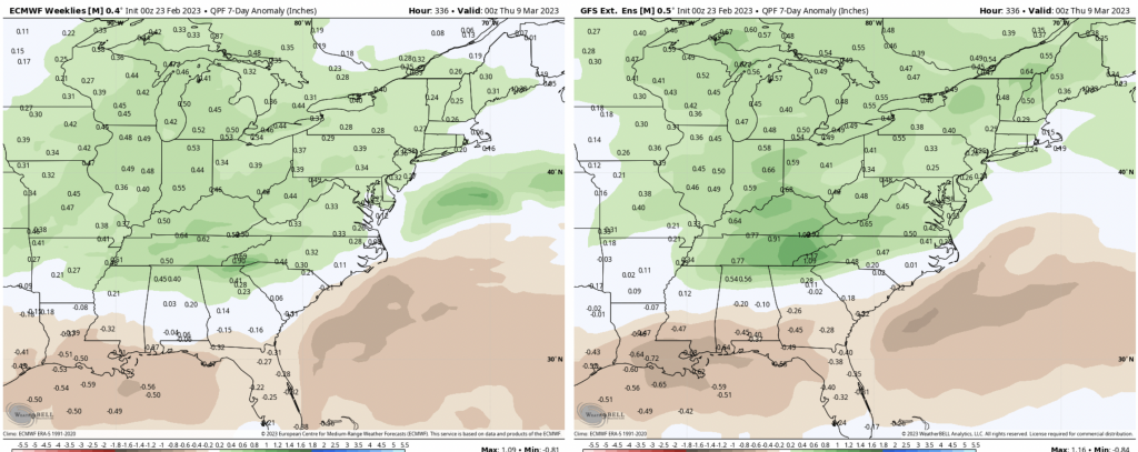 The overall trend is a cooler March for most; though it’s a bit tumultuous to start. In the next 7 days, we’ll have a fair amount of warmth from the Mid-Atlantic and south with the southeast ridge in place. Notoriously, the GFS handles the southeast ridge better than the Euro, therefore I’ll be hedging my bets a little more on the GFS. We’ll have somewhat below average temperatures in southern New England to well below average temperatures in northern New England. The precipitation anomalies remain above average in the region, with the exception of far northern Maine. Right now there are two storms to watch – Tuesday and Thursday.