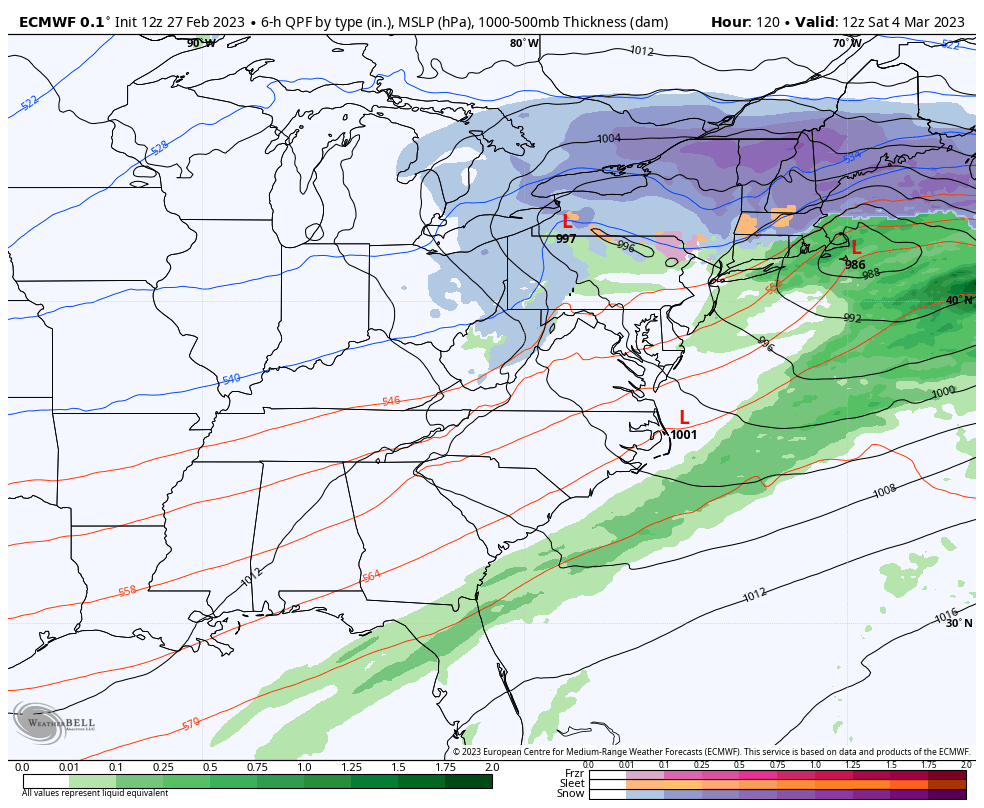 At this point the SE ridge is being ejected into the Atlantic, so I’m more middle of the road when it comes to GFS vs. Euro. Both have the low pressure near the 40/70 benchmark but the GFS is bringing in quite a bit more mixing. Usually with a storm at the benchmark, we have enough cold air to circulate in, therefore I’m thinking there’s some discrepancies coming through in the feedback of precipitation type, or the low is being misplaced and is perhaps inside the benchmark. We are in a pattern transition, therefore having some contradictions within the model is not surprising.