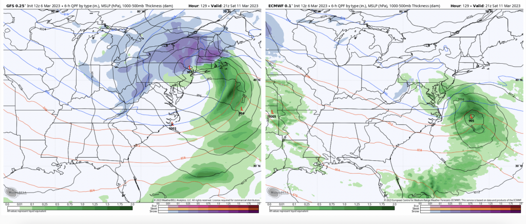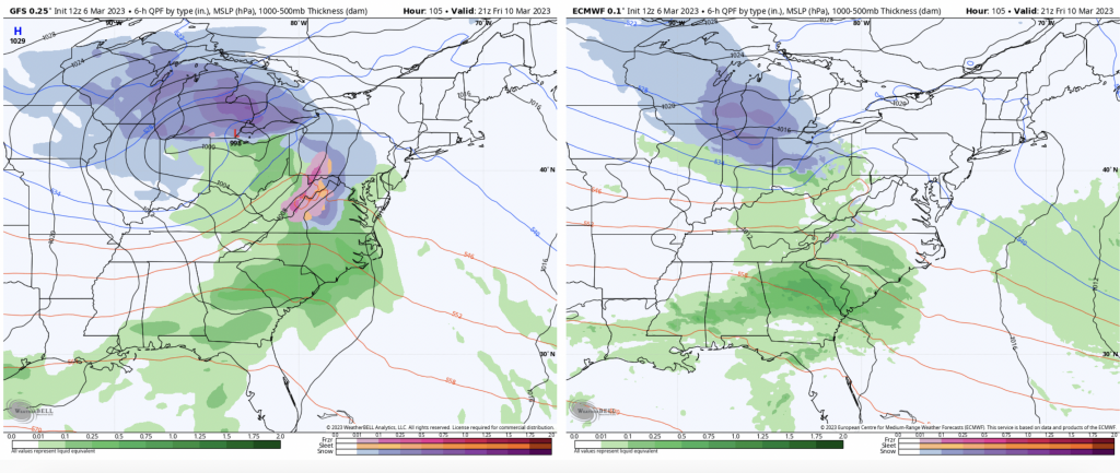 This quiet time reenergizes the pattern into the end of the week, and unfortunately there is little consensus and a myriad of scenarios that have been playing out. The eastern trough is returning from the east, which is a pattern change that the models are struggling with. I will say the GFS has been first on board picking up on storm systems, and then eventually the Euro comes along with a better depiction in Days 3-5. Here’s the possible scenarios for Friday/Saturday.