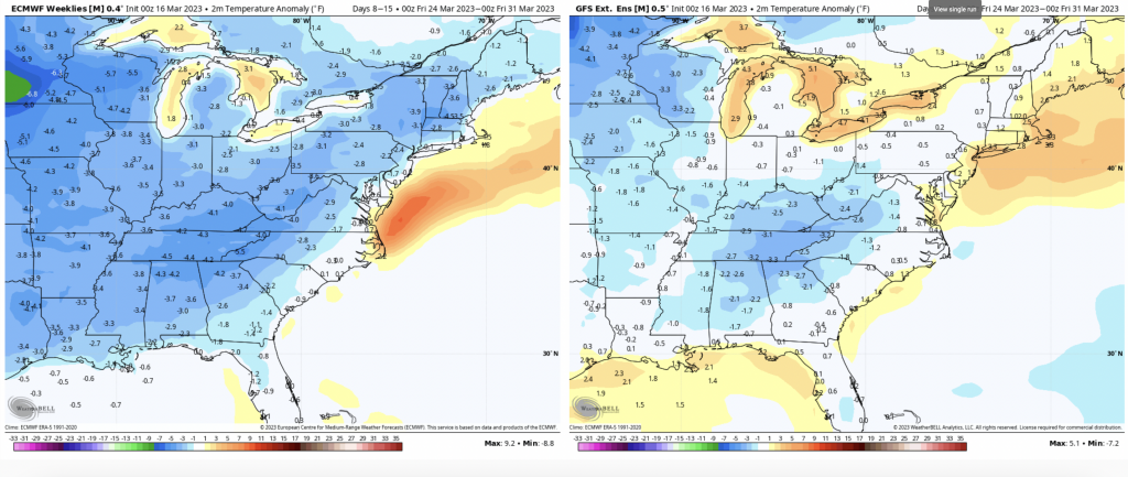 Though cooler air settles in for the first part of next week, we’ll have moderation toward the midweek before a couple more storm systems start to ramp up. There are a few to watch – around 3/23, 3/25 and 3/28. The NAO stays close to neutral (therefore not much blocking of cold air) for 3/23 but moves negative thereafter.