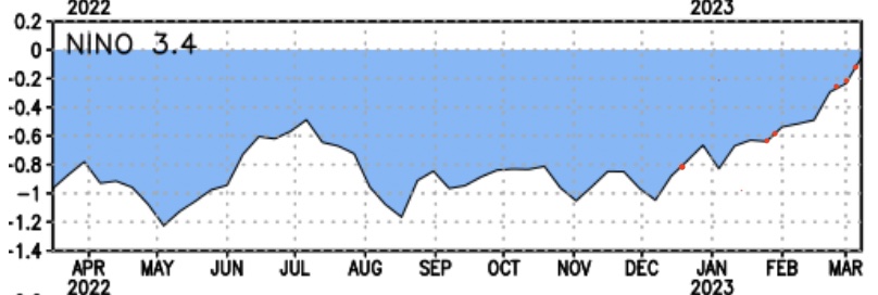 The ENSO cycle remains neutral right now after quickly moving out of the La Nina space we had been in for nearly 3 years. An interesting feature is that it was in those moments we were seeing the index climbing toward neutral ENSO (near zero), that some of our major snow events occurred this season.