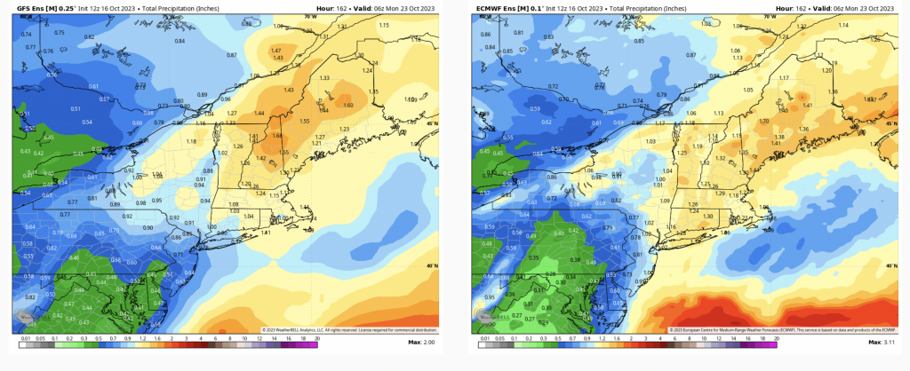 Rainfall amounts remain low for the beginning of the week, but this weekend could bring substantial rain to the Northeast. While there’s not great consensus on the evolution of the system (mostly due to the fact that there are multiple lows), there’s decent agreement on how much rain is going to fall from Friday evening through Sunday night.