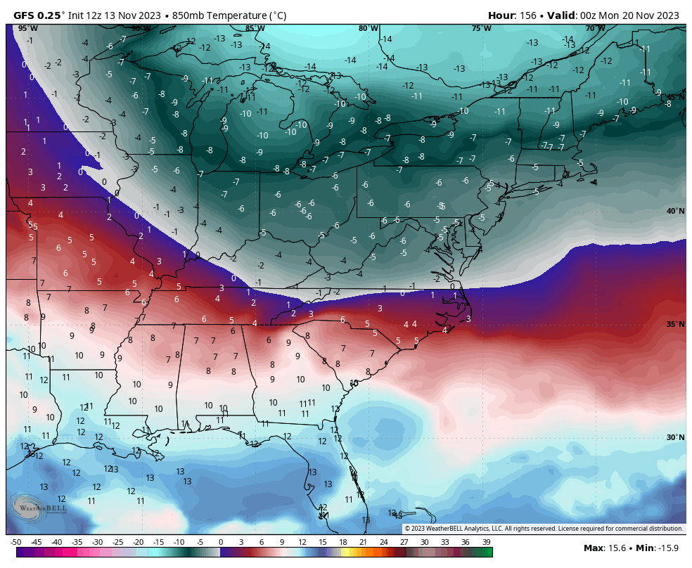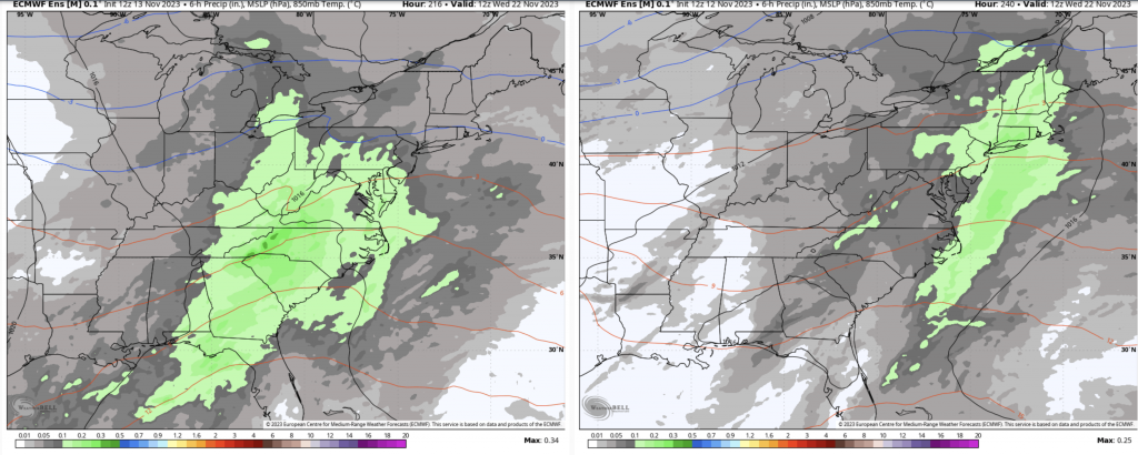 We’ll see temperatures fall through the day Saturday and steady off into Sunday before another surge of cold brings another shot of cold air in for Monday of Thanksgiving week – potentially the strongest cold punch of the seasons so far. This could be the first time areas in the Great Lakes and Mid-Atlantic can fire up the guns…will continue to watch the depth of this cold blast.