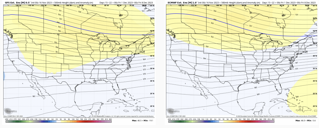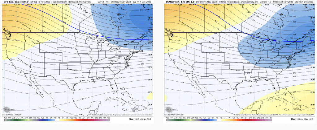 We’re still in a period where I don’t believe the models are really understanding the long term very well, but since we’re in such a critical time frame, I wanted to post some initial thoughts. With a couple strong cold pushes over several weeks, it makes sense to have a break. Very long range signals (for what they’re worth) show the cold returning the week before Christmas.