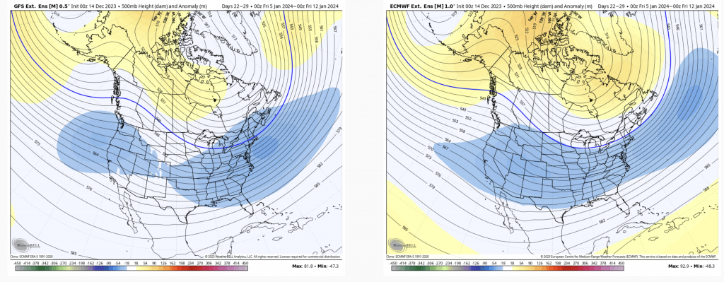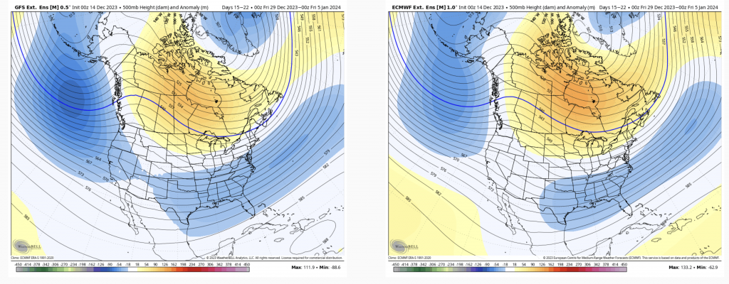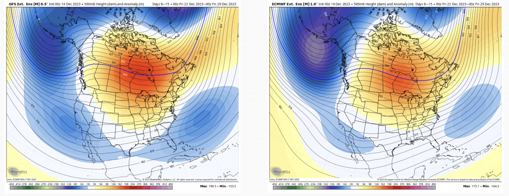 For Days 7-14, we are in the thick of it in the NE. While the bright red spot in the middle of Canada looks menacing, these are 500mb height anomalies. That means have high pressure in that red center; and with clockwise flow around high pressure, it’s delivering cold air into the east, while the Great Lakes and Midwest likely stay under warmer conditions for another couple of weeks before see the cold shift back toward the center of the country. The GFS is a little stronger with the negative in the Atlantic, but I prefer that solution, as we should have more equal magnitudes of anomalies. This setup signifies an active pattern while seeing more frequent and consistent cold intrusions in the east — focused more so after Christmas.