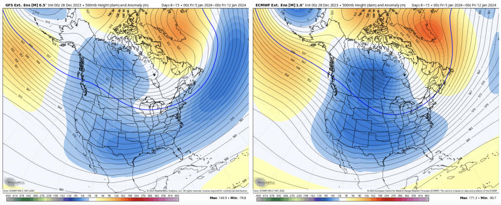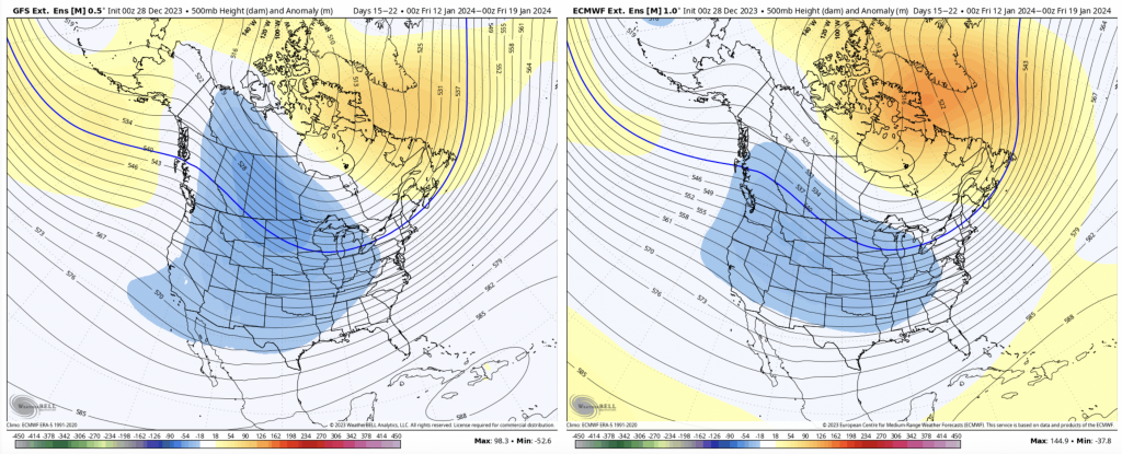 Beyond Day 21, there’s a lot of discrepancies — the 500mb anomaly doesn’t match up with the teleconnections. There will probably be a continued ease of the pattern before the cold comes back, but the details in this are too disconnected at this point.