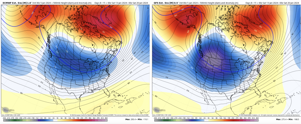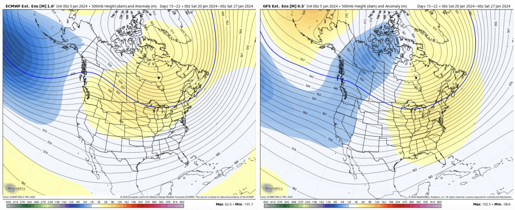 There’s decent agreement among the GFS/Euro regarding the placement of a mild ridge over the east. This is fairly normal after a cold pattern, which we technically got into on Dec 29/30. Therefore by this point, it will have been 3 weeks. The Euro is a bit more broad brushed with the ridge, which isn’t a very warm solution (and that’s against the usual bias of the Euro as it doesn’t like to see cold).