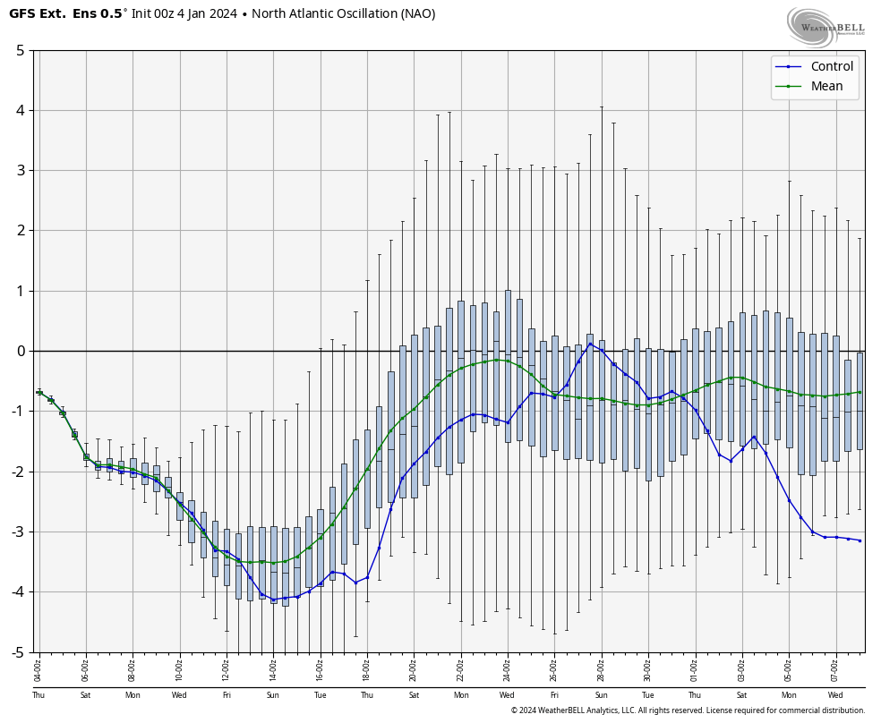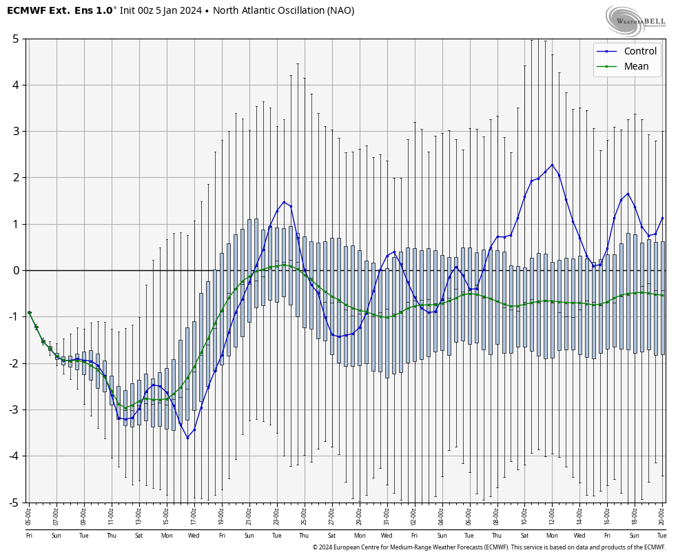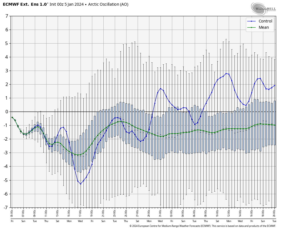 For more support of that point, I bring up the AO — the AO showcases the availability of arctic air, where the NAO identifies if we have the blocking to hold it. The AO tanks in the same way that the NAO does, but doesn’t even get to the zero line, which says we’re not seeing anything tremendously warm, just less cold, before it starts heading back to more negative territory.