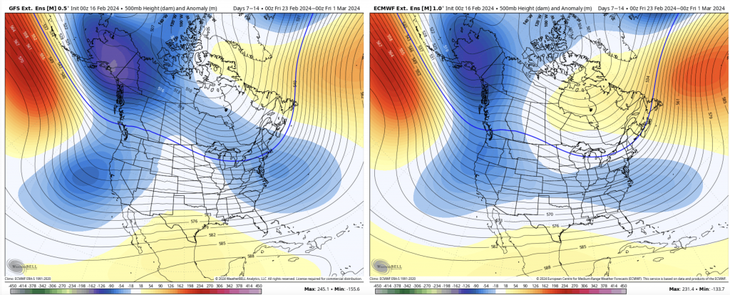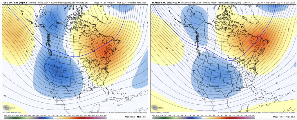 The Euro is a little quicker in this transition, apparent in the right image as the highest heights are pushed to the Canadian Maritimes. Perhaps another miracle March on our hands? We shall see, but given the El Niño drop into early spring, I would not be surprised with an interestingly active late March through April pattern.