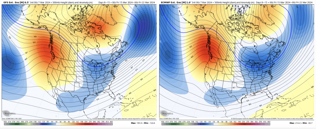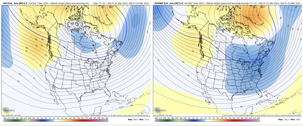 For Days 14-21, the GFS and Euro have similar overall pattern. The GFS washes out the lower height anomalies but the height lines are roughly the same. This will keep some semblance of winter in the forecast through the end of the month.