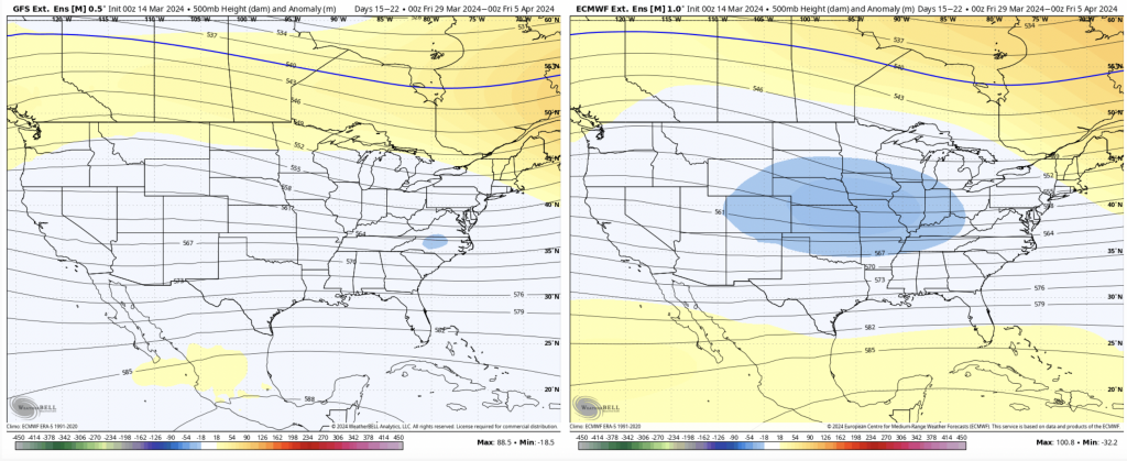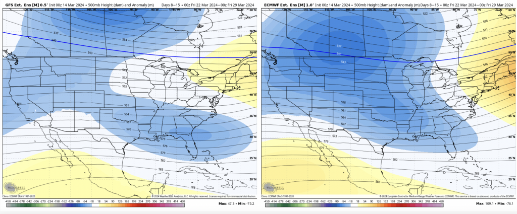 The NAO/AO stay negative through the time period as well, which signifies staying in a relatively cooler pattern for the end of the month. The PNA is negative to start this period but then moves to neutral/slightly positive by March 24/25.